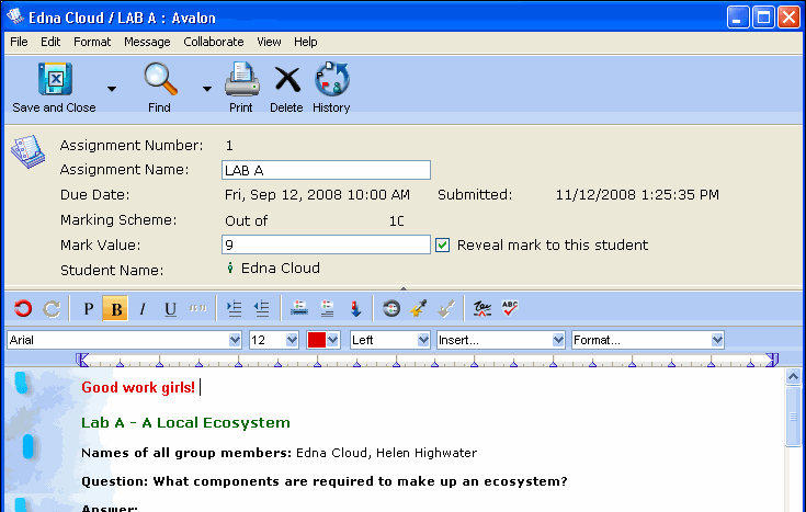 Michael uses the roster to keep track of his students' marks for homework, classwork, labwork, tests, and exams. Students complete their homework and labwork online, so Michael makes his comments in the document, enters a grade on the online form, and then selects Reveal mark to student, which automatically updates the roster.