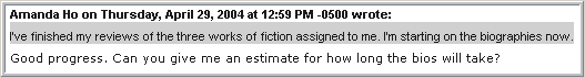 Messages with the same subject, that were sent in reply to other messages, are presented in a special way. As replies to messages accumulate, they create a thread. Each reply in the thread is numbered; by default, the subject of the first reply starts with "Re:", the subject of the reply to this reply starts with "Re(2):", and so on.